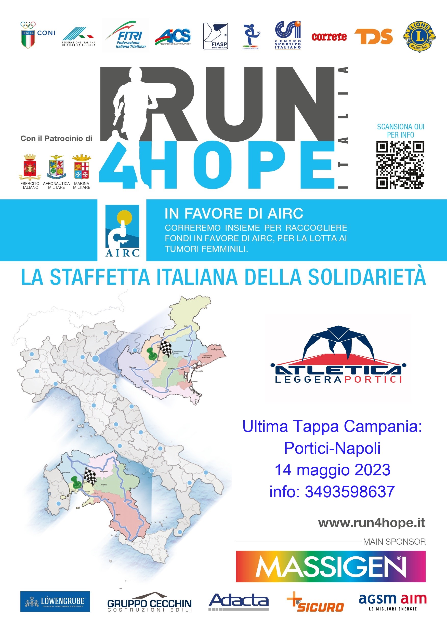Per il terzo anno, l'Atletica Leggera Portici ha corso l'ultima frazione della staffetta, nella tratta da Portici a Napoli. Proprio qui, a Piazza Trieste e Trento, ha consegnato il testimone all'Esercito, partner della Run4Hope, raggiungendo anche lo stand dell'AIRC, l'Associazione Italiana Ricerca sul Cancro.